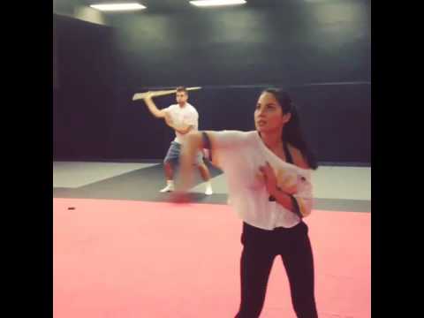 Olivia Munn (and Aaron Rodgers) sword training.